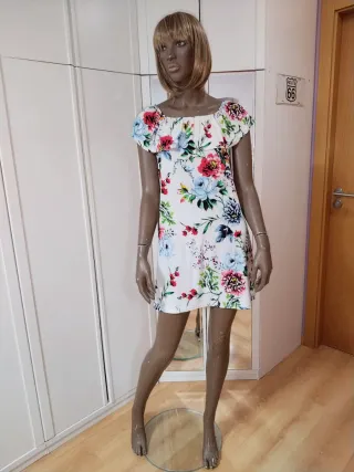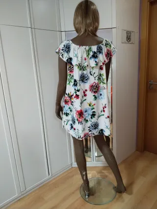 Vestido corto con un llamativo estampado floral,muy poco usado y bien conservado,no presenta ningún deterioro,muy cómodo. Yo llevo una XS, pero talla has una M, porque se ajusta en los hombros y luego es holgado. - Diseño con escote elástico. - Mangas cortas. - Largo por encima de la rodilla.