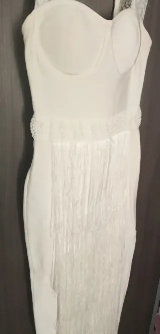 Elegante vestido largo de fiesta en color blanco. Presenta un diseño con tirantes de encaje y un detalle de flecos en la parte inferior de la falda. - Tirantes con detalle de encaje. - Cuerpo con copas. - Falda larga con flecos.