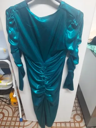 Vestido largo de tela brillante con un llamativo color verde azulado. - Mangas largas abullonadas. - Detalle de fruncido en la parte delantera. - Corte elegante y moderno.