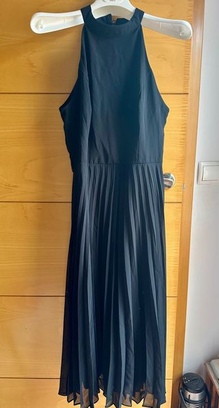 Elegante vestido negro con falda plisada y escote halter. - Diseño moderno y sofisticado. - Largo midi. - Cierre de cremallera en la espalda.