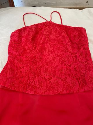 Precioso vestido largo de color rojo, hecho a mano. Es una prenda única y elegante, ideal para una ocasión especial. - Diseño entallado que realza la figura. - Confeccionado con tela brillante. - Adornado con detalles de pedrería. -Talla 38/40