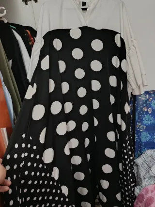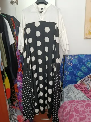 Vestido largo con un diseño llamativo de lunares. - Diseño de lunares grandes en la parte principal. - Mangas con volantes. - Parte inferior con lunares más pequeños.