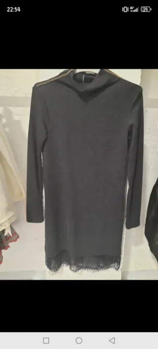 Dos preciosos vestidos de punto, uno negro y otro beige Ambos son de manga larga y tienen un diseño elegante y sencillo. El beige sin estrenar,el negro puesto una vez. - botones dorados de adorno. - Diseño de canalé. - Corte recto.