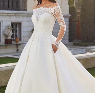 Elegante vestido de novia de Pronovias, en color crema Un diseño clásico y romántico, con corte princesa. talla 38-40 - Cuerpo de encaje con escote Bardot. - Mangas largas de encaje. - Falda voluminosa con bolsillos.