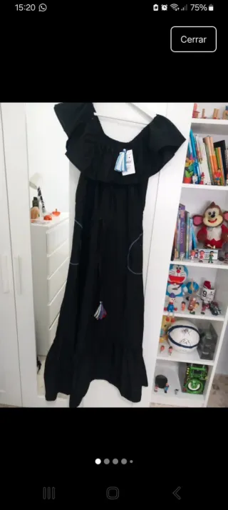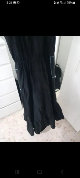 vestido largo de tela suave y agradable ideal para entretiempo , corte en la cintura y volante en el bajo detalle en las mangas , talla L , grande .