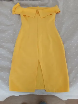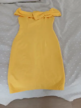 Vestido de corte elegante en color amarillo . Diseñado para un ajuste favorecedor. - Escote Bardot con detalle de lazo. - Silueta ajustada. - Largo hasta la rodilla.