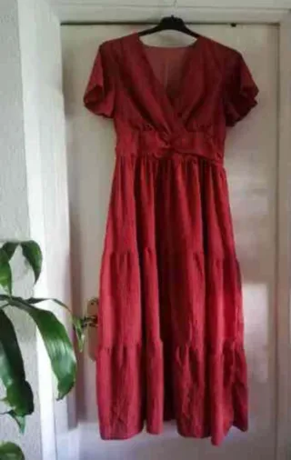 Vestido largo 100 % poliéster Color coral Diseño de volantes - Talla M - Corte cruzado en pecho - Cintura elástica. - Falda con varios volantes. - Tejido rayado - Manga corta mariposa - Espalda con elástico fruncido - ( Una mancha a penas apreciable en delantero bajo lateral )
