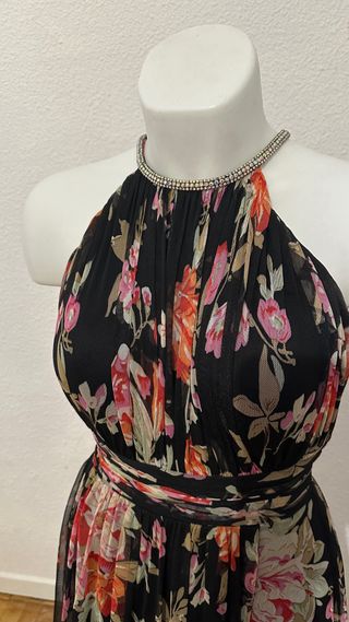 Elegante vestido largo con un estampado floral vibrante. Perfecto para ocasiones especiales. - Diseño de cuello halter. - Detalle de pedrería en el cuello. - Cintura marcada con fajín. - Tejido ligero y vaporoso.
