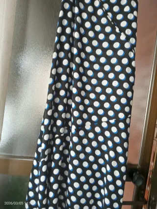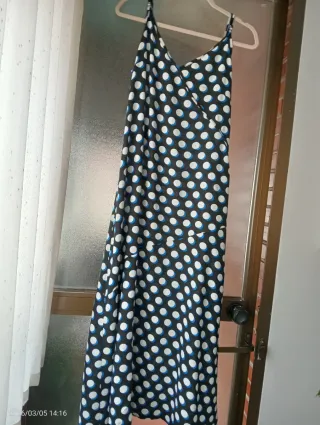 Vestido largo con un estampado de lunares y escote en V. La talla corresponde más a una TL. Es muy cómodo, fácil lavar y secar por si composición. Lleva dos cortes asimétricos, uno debajo del pecho y otro a la altura de la cintura. - Diseño sin mangas con tirantes regulables - Largo hasta los tobillos. Entrego en Madrid capital y también hago envíos.