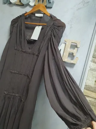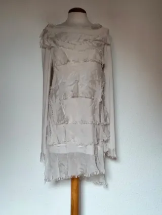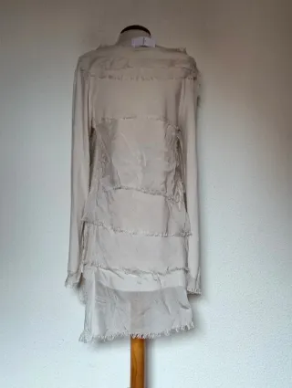 Vestido de manga larga con un diseño de capas y acabado deshilachado. Sisa 44 cm Largo 84 Manga extra larga 65cm‼️ Viscosa, seda , elástico - Diseño de capas. - Acabado deshilachado en los bordes. - Cuello redondo.