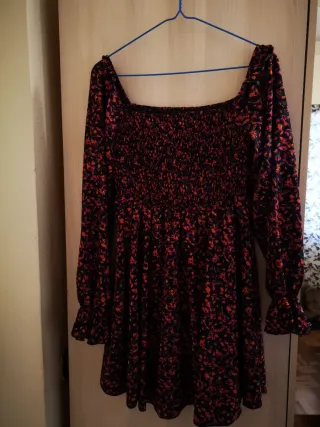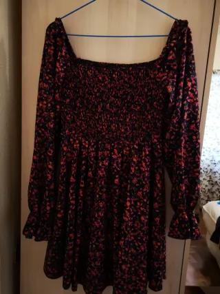 Vestido con un bonito estampado floral que combina colores vivos y detalles de hojas. - Diseño con cuello redondo. - Cintura elástica para un ajuste cómodo. - Mangas largas. - Tejido ligero y fluido.