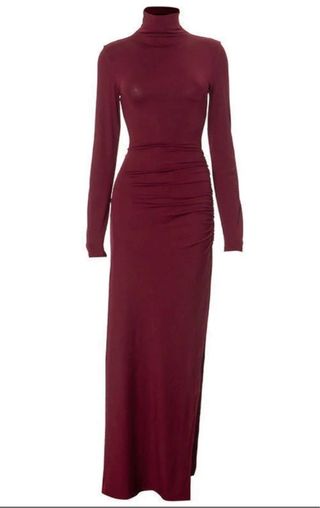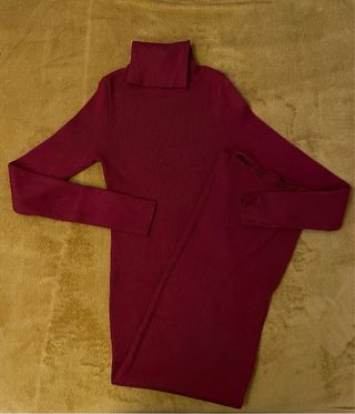 Vestido largo de punto en color burdeos con cuello alto. - Tejido acanalado. - Manga larga. - Corte ajustado.