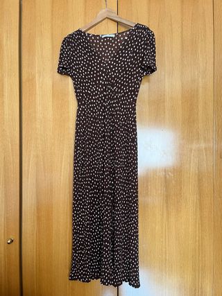 Vestido largo de Mango con estampado de lunares blanco roto sobre fondo marrón. Ideal para cualquier ocasión. Sin usar. - Diseño de manga corta y escote de pico. - Largo hasta los tobillos. - Cintura marcada. - Queda muy bien.