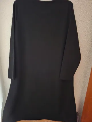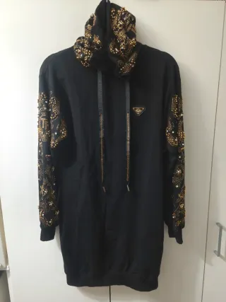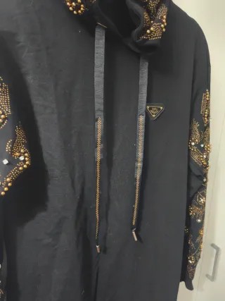 Vestido o sudadera larga con capucha en color negro con brillantes dorados. En muy buen estado, se han cortado las etiquetas y se le han caído un par de cristales en la zona de la capucha como se puede ver en las fotos. Creo que es una talla M, dejo medidas: Medida hombros: 60 cm Medida sisa a sisa: 62 cm Medida largo: 85 cm