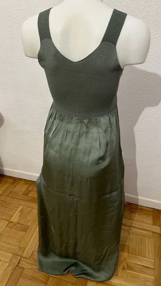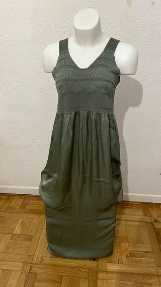 Vestido largo de manga corta en un tono verde militar. Su corte es recto y llega por debajo de las rodillas. - Talla: M. - Medidas: 52 cms de sisa, 114 cms de largo. - Diseño de cuello redondo. - Manga corta. - Largo hasta la rodilla. - Material: 65% Viscosa, 35% Poliester.