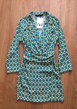 Vestido corto de Zara con un llamativo estampado geométrico. - Diseño cruzado con drapeado. - Manga larga. - Escote en V.