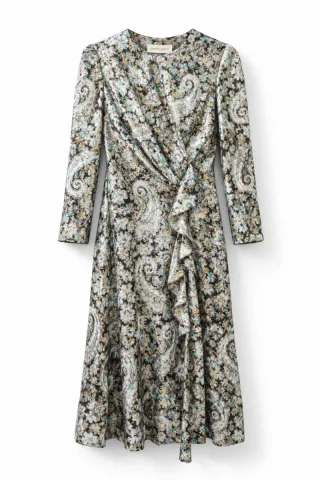 Vestido largo con estampado floral y paisley. - Diseño cruzado. - Detalle de volantes. - Manga larga.