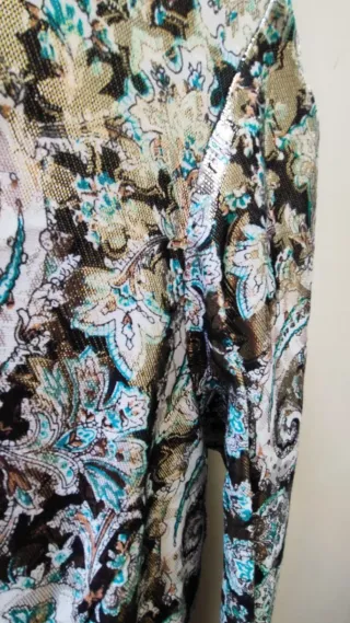 Vestido de la marca Nine West con un estampado vibrante y llamativo. - Diseño con cuello en V y manga larga. - Cierre de botones en la parte frontal. - Tejido ligero y fluido.