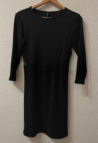 Vestido elegante de Stradivarius con detalles de encaje en los laterales. - Manga larga. - Corte entallado. - Color: negro. - Talla: L. EN PERFECTO ESTADO.