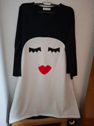 Vestido de manga larga con un divertido diseño de cara sonriente. - Diseño frontal de cara con labios rojos y lunares. - Mangas largas negras. - Base blanca con detalles negros. Nunca lo he usado. Da bastante talla
