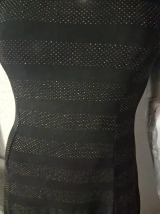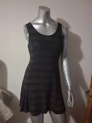 Vestido negro con un diseño de franjas doradas que le dan un toque especial. Su corte con vuelo lo hace muy favorecedor. - Talla: S. - Medidas: 38 cms de sisa, 76 cms de largo. - Diseño de franjas horizontales. - Corte con vuelo en la falda. - Material: 65% Viscosa, 35% Elastano.