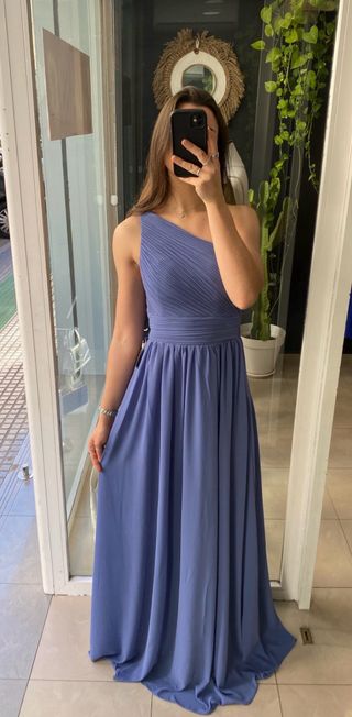 Vestido largo de graduación con un diseño elegante. - Escote asimétrico. - Detalle drapeado en el pecho. - Cintura marcada. - Falda fluida.