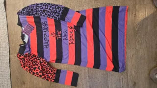 Vestido con un diseño llamativo y original. - Mangas largas con estampado de leopardo. - Cuerpo de rayas verticales en morado, negro y rojo. - Inscripción HAPPINESS IS THE NEW ROCK en el frontal.