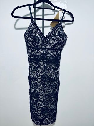 Vestido sexy de encaje transparente con forro color piel un diseño delicado. - Escote en V. - Tirantes finos. Y regulables - Largo hasta la rodilla. - Forro interior. -cremallera en espalda dorada