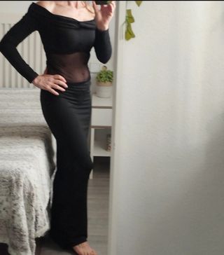 Elegante vestido largo negro con escote Bardot y detalle de transparencia en la cintura. Ideal para eventos especiales. -t.xs pero puede servir para talla s/m también - Diseño de manga larga. - Tejido elástico y cómodo.