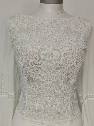 Elegante vestido de novia de Rosa Clará, modelo Cabana. Un diseño sofisticado y romántico. - Cuerpo de encaje floral con manga larga. - Falda larga con cola. - Escote alto. -Escote grande en espalda y cuadrada Tiene un lacito azul por la tradición de llevar la novia algo azul. Cierre trasero con cremallera. Se recomienda lavar en sitio especializado por almacén y probador. Se recomienda comprobar las medidas por que talla pequeño. Medidas ( tomadas a mano por lo que puede variar en 1-2cm): Hombros: 42 cm Pecho: 46,5cm Cintura: 47 cm Cadera: 58cm Largo manga: 70 cm Largo cola: 175 cm ( desde el encaje de la cintura hasta el final)