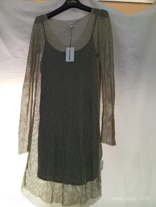 Vestido de fiesta con un diseño elegante y llamativo. - Tejido de malla con detalles dorados. - Incluye un vestido interior negro. - Manga larga.