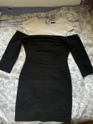 Vestido de Zara con un diseño bicolor. - Parte superior blanca. - Parte inferior negra. - Mangas largas.