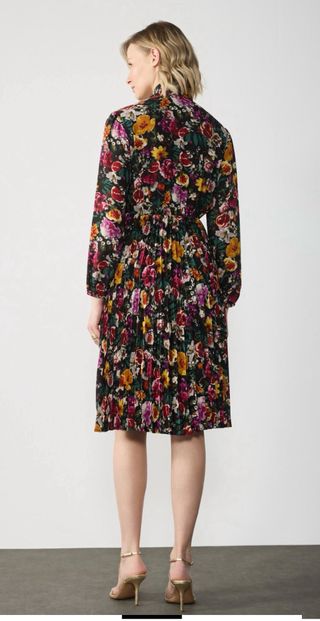 Vestido de manga larga con estampado floral sobre fondo negro. Presenta un diseño con cuello anudado y falda plisada. - Estampado floral vibrante. - Cuello con lazada. - Falda plisada.