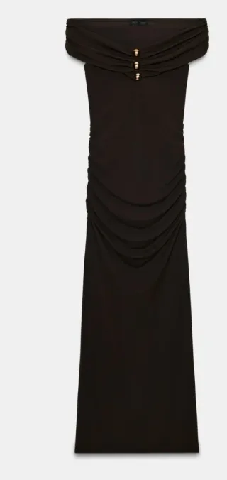 Vestido largo de Zara, sin estrenar. Un diseño elegante y moderno. - Escote Bardot. - Detalle de botones dorados. - Fruncido lateral. - Largo hasta el suelo.