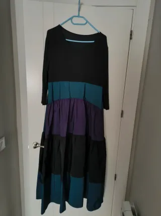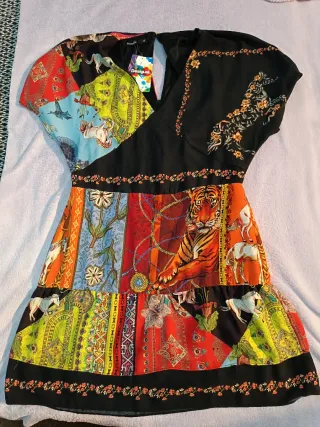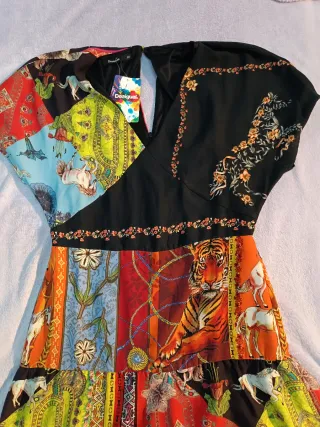 Precioso vestido en colores y estampados variados. Talla: 38 Contorno de pecho: máximo 100 cms. Cintura: 80 cms. Largo: 96 cms.