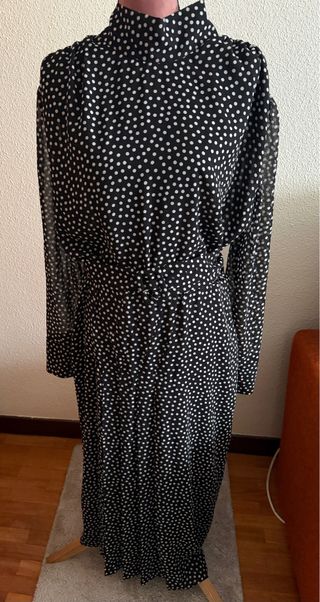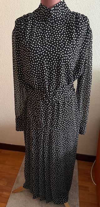 Vestido largo de Zara con un elegante estampado de lunares. - Diseño con cuello alto. - Mangas largas y transparentes. - Cintura con cinturón forrado en la misma tela - Forro interior - Cremallera lateral - Medidas: Longitud 132cm Distancia de sisa a sisa 55cm Circunferencia cintura 88cm Circunferencia busto 104cm Distancia entre hombros 47cm