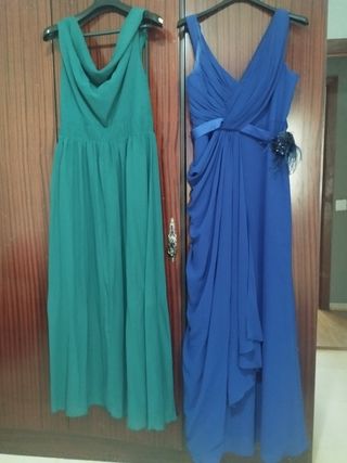 Dos vestidos largos, uno en tono azul vibrante y otro en verde esmeralda. Perfectos para eventos especiales. El verde ha sido usado para una boda, el azul es nuevo. Talla 44 ambos. El precio es por vestido, si te llevas los dos los dejo en 40€