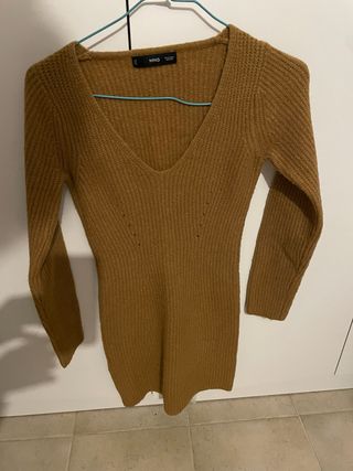 Vestido de punto con cuello en V, ideal para el invierno. Su diseño ajustado realza la figura. - Manga larga. - Tejido de punto acanalado. - Largo hasta medio muslo.