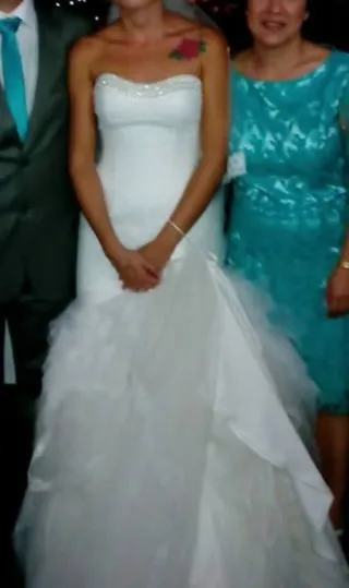 Elegante vestido de novia de palabra de honor y de corte de sirena, con un velo largo y detalles de encaje. 1000€ negociables. - Falda voluminosa con varias capas de tul. - Velo con borde de encaje.