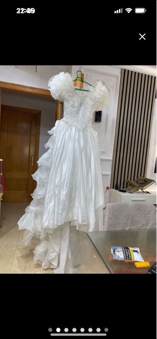 Elegante vestido de novia de color blanco, con un diseño voluminoso y detalles de volantes. - Cuerpo con encaje y pedrería. - Falda con múltiples capas de volantes. - Mangas abullonadas. - Cola larga.