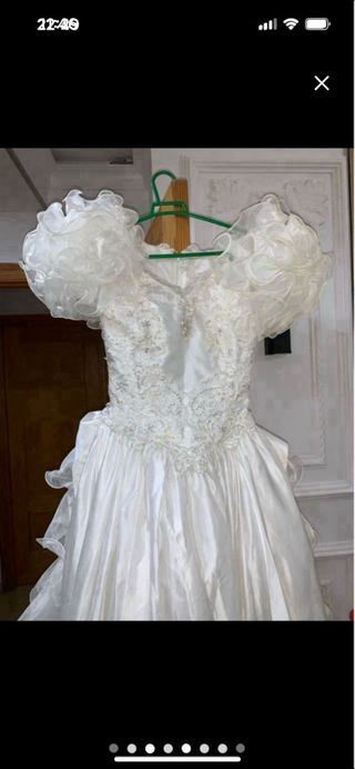 Maravilloso y elegante vestido de novia de la marca Adriana Alier (Rosa Clara). Arreglado a mano , precioso escote en V con detalles de encaje y una hermosa espalda descubierta. Medidas: Pecho: 90 cm Cintura 85 cm Largo 1,90 cm de falda + 1,30 cm desde la cabeza hasta el comienzo de la falda . Precio original de vestido más cancán: 2.000€. Solo un uso.