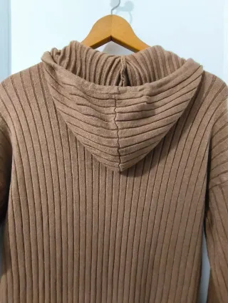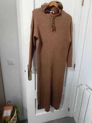 Vestido largo de punto con un diseño moderno y cómodo. - Tejido de canalé. - Capucha con cordones. - Manga larga. - Aberturas laterales.
