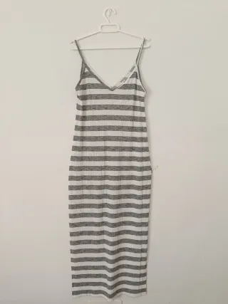 Vestido largo con un diseño de rayas horizontales en gris y blanco. Tiene tirantes finos y escote en pico. - Tejido acanalado. - Diseño de rayas verticales.