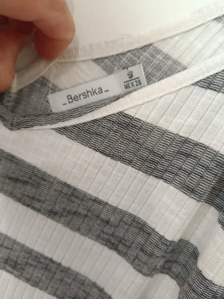 Vestido de punto gris de Stradivarius. - Cuello en pico. - Manga larga. - Bajo y puños de canalé.