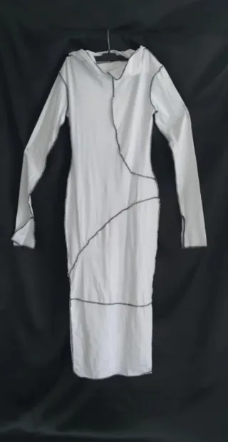 Vestido largo y ajustado con un diseño moderno y costuras visibles. - Capucha - Cuello alto - Mangas largas - Diseño con paneles cosidos - Largo hasta el tobillo