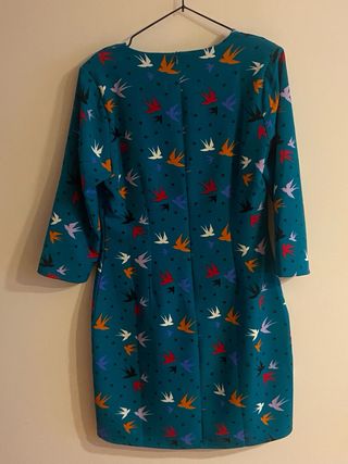 Vestido de la marca Minueto con un estampado de pajaritos en varios colores sobre un fondo verde azulado. - Diseño con cuello ligeramente torcido en un lado, lo que le da un aspecto muy original. - Manga larga. - Corte recto.