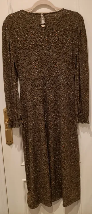 Vestido largo con estampado de leopardo en tonos verdes y marrones. Presenta un cuello redondo y manga larga. - Estampado de leopardo. - Cuello redondo. - Manga larga.