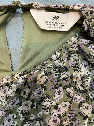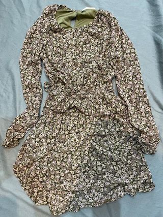 Vestido de manga larga con estampado floral sobre fondo verde. Presenta un diseño con cintura elástica y volantes. Talla 13-14, se ajustará a XS-S. - Escote redondo con abertura en la espalda. - Mangas largas abullonadas con puños. - Falda con volantes.