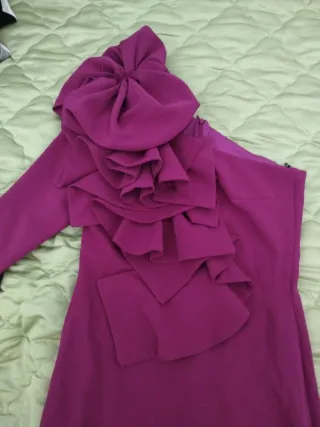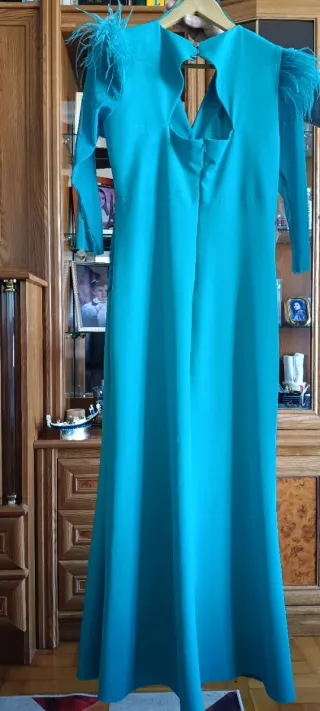 Elegante vestido de fiesta, ideal para eventos especiales. Solo se ha usado en una ocasión. - Diseño largo y sofisticado. - Detalle de plumas en los hombros. - Espalda con abertura. - Cierre de cremallera.