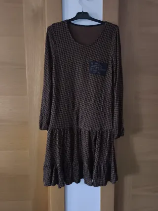Vestido de mujer con un estampado llamativo y detalles bordados en el escote. La cintura está ajustada. Vestido largo con una sola manga. Queda muy bonito. Los 3 vestidos 15 euros.